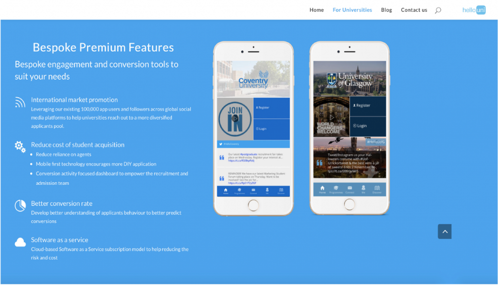 HelloUni is an application to help foreign students onboard to UK universities including Glasgow university and university of Edinburgh. The application allows potential students to research the uni build connections in the UK before transferring.