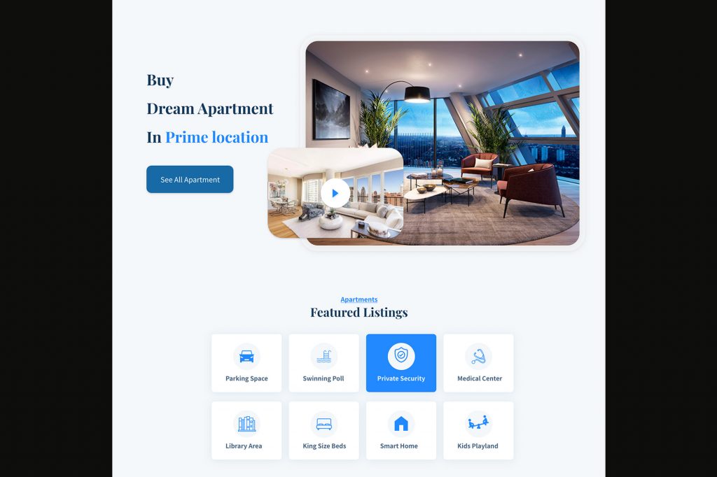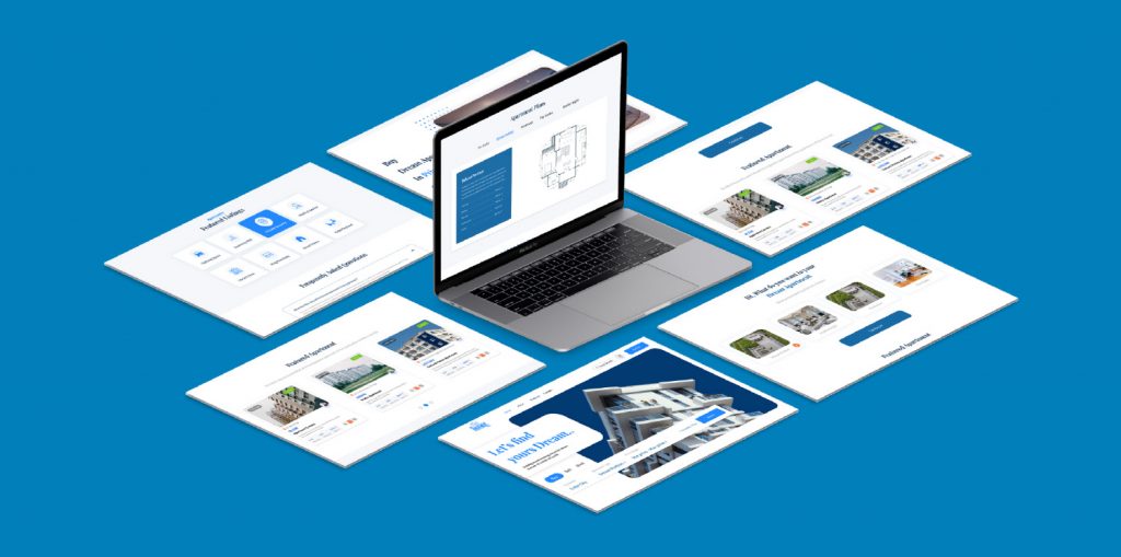 Website with search function to a database of properties to buy, sell or rent. Sleek user interface that shows off the apartments highlights and floor plan.